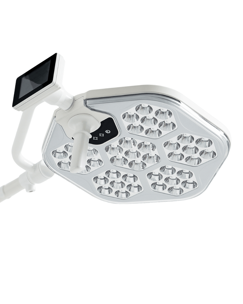 A sleek high adjustable intensity LED surgical lighting system with a touch-screen and wireless remote features. This well-built line is designed to minimize contamination from blood, chemicals, and air circulation and is easy to clean.